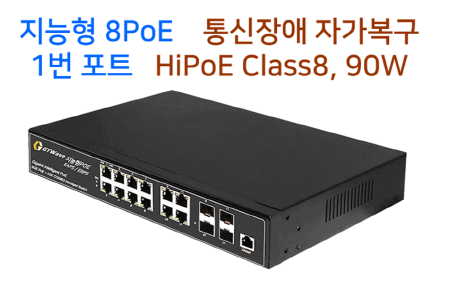 PoE 8포트* Gbps / 업링크 4포트 * Gbps + 4SFP(Combo) / 1번 포트 90W, 그외 PoE 포트별 최대 30W지원 // BT지원 Class8 // 링구성 지원