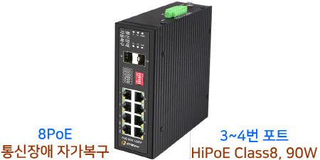 ◎ 옥외에 설치된 CCTV 및 AP가 주변 환경의 전자파 또는 낙뢰시 써지보호기 문제로 인하여 PoE포트에 연결된 장비의 통신 상태 장애시 , 포트별로 연결된 PoE네트워크 장비의 전원을 자동으로 off/on하여, 장비의 네트워크 연결을 복구하는 자가 복구POE 장비 입니다.