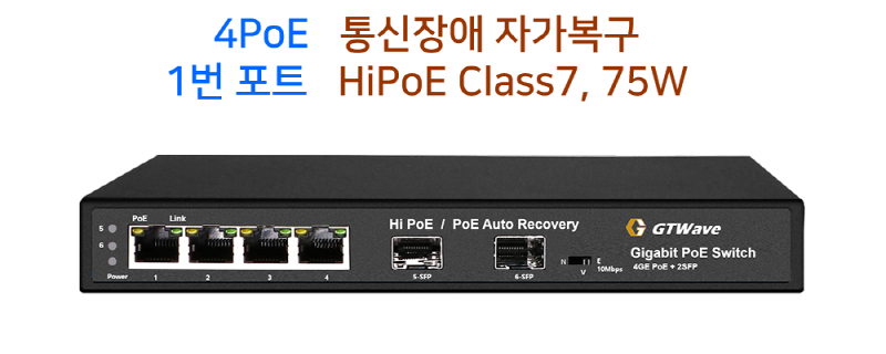 4포트 PoE + 2SFP // 1번 포트 75W, 그외 PoE 포트별 최대 30W지원 // IP카메라 통신장애 자가복구 기능 // BT지원 calss7