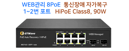 PoE8포트+ 2SFP / 포트 1,2번 HiPoE지원 / BT Class8, 90W