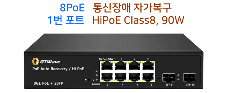 8포트 PoE + 2SFP // 1번,2번 포트 90W, 그외 PoE 포트별 최대 30W지원 // IP카메라 통신장애 자가복구 기능 // BT지원 calss8