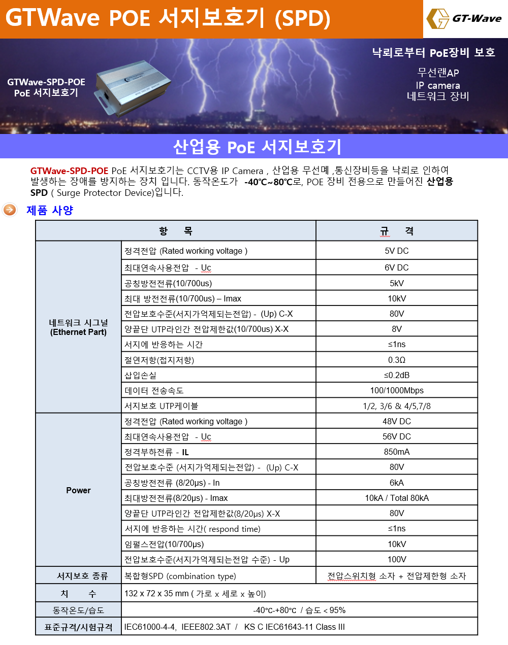 GTWave-SPD-POE 서지보호기는 CCTV용 IP Camera , 산업용 무선AP ,통신장비등을 낙뢰로 인하여 발생하는 장애를 방지하는 장치 입니다. 동작온도가 -40℃~80℃로, POE 장비 전용으로 만들어진 산업용 SPD ( Surge Protector Device)입니다.